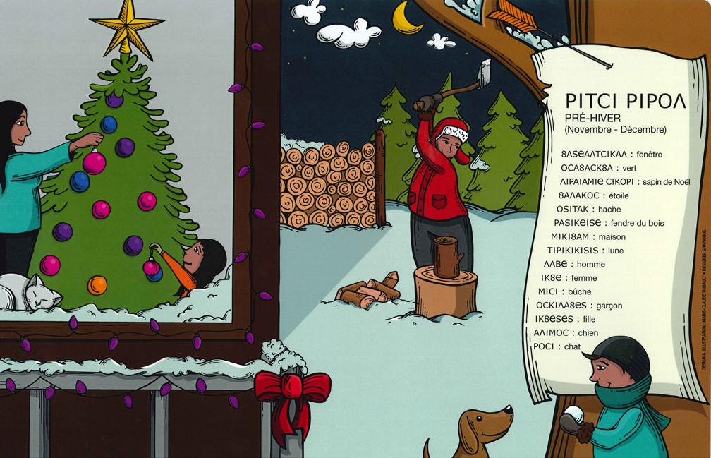En collaboration avec l'illustratrice Marie-Claude Thibault, le programme Avenir d'enfants Nikan Apinotcicak a créé 6 magnifiques napperons sous le thème des 6 saisons Anicinape. Chaque napperon plastifié enseigne une quinzaine de mots de vocabulaire et offre des jeux et des recettes pour les enfants au verso. Ces napperons ont été distribués auprès des familles ayant de jeunes enfants à Pikogan.